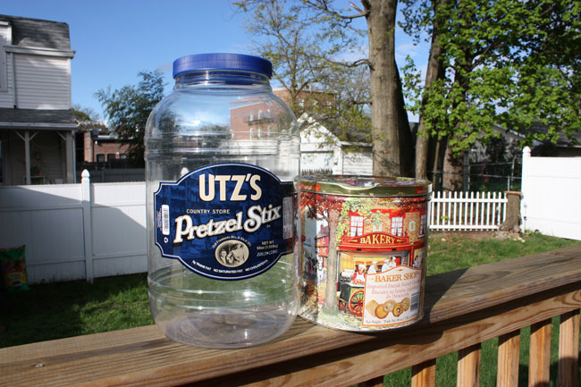 I've done it in the past years using plastic pots that you can buy at any garden store. Recently I was reading Design*Sponge and saw Kate's project for making your own pots from various containers you have in your recyling bin and I thought that was brilliant. You can find instructions on how to create your upside down hanging planter all over the internet, but Kate laid out a great tutorial that looks cute.
