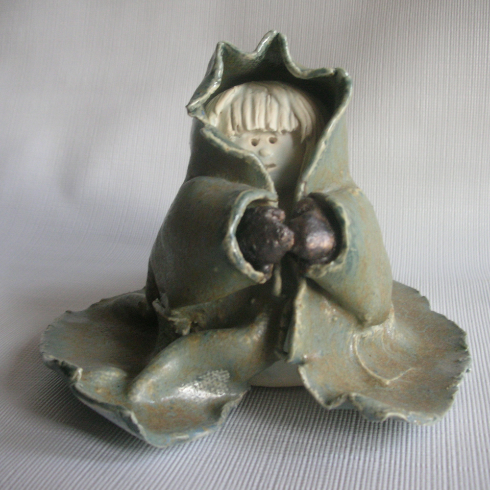 November 30, 2007 After spending several weeks on my sweet lynx mask I needed a little break. So I was just fooling around and decided to try and sculpt a little person - similar to the little people I doodle. I started creating little people when I was very young - I liked making up personalities and outfits for them. Then, during college, I started doodling less realistic munchkin people. I don't really know what you would call them - they have round heads, shapeless bodies, and draping cloaks. So anyway - I sculpted one out of clay and then doused it heavily in agate and bronze glaze.